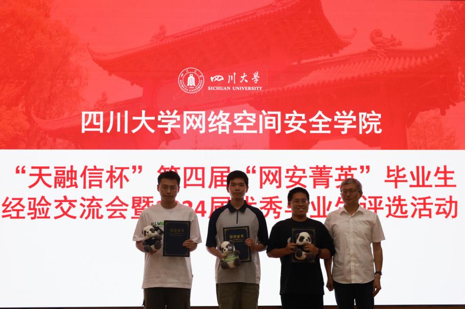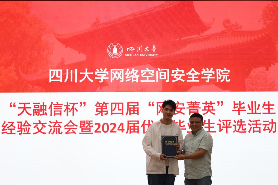 2024年6月14日晚,必赢76net线路天融信杯”第四届“网安菁英”经验交流会暨2024届优秀毕业生评选活动于江安校区多学科交叉大楼一楼报告厅举行,天融信科技集团四川平台副总经理邹晓波、渠道总监连文浩、教育公司总经理龙刚,必赢76net线路副院长杨频以及学院多位老师出席了此次活动。