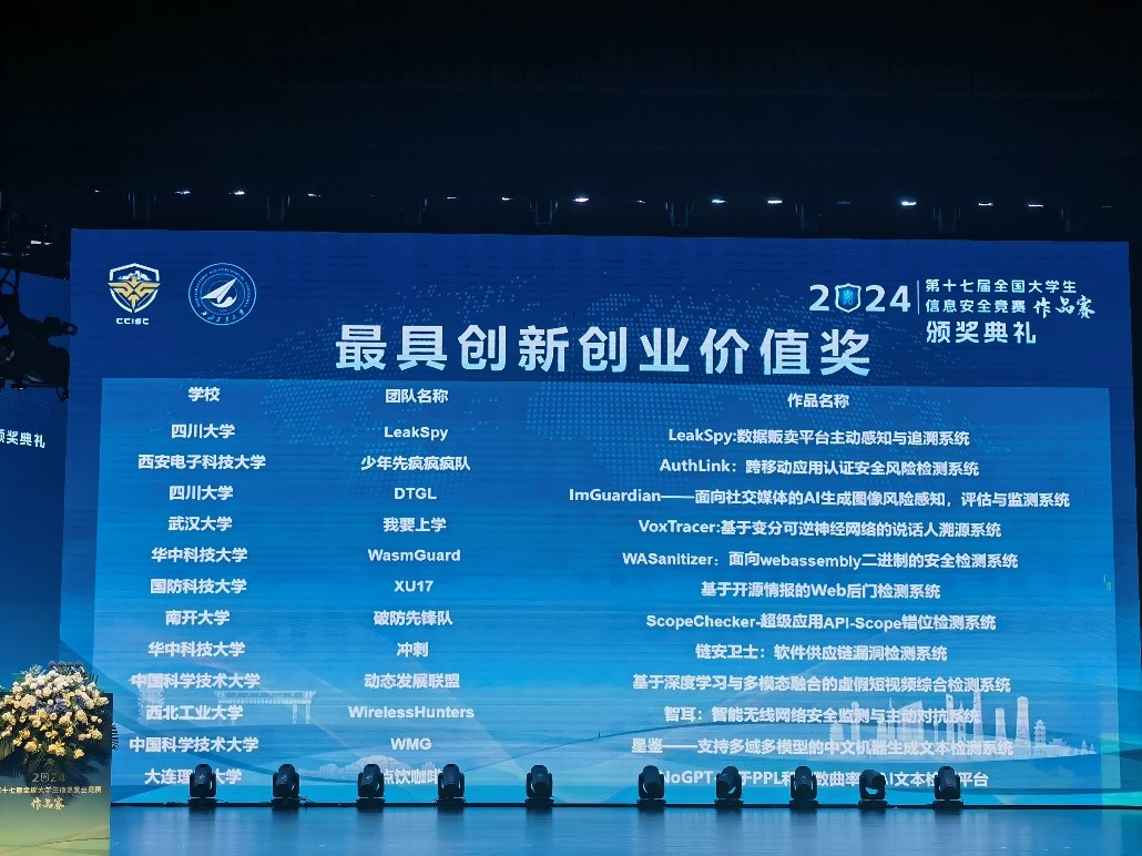 近日,第十七届全国大学生信息安全竞赛(作品赛)总决赛在江苏太仓举行。经过激烈角逐,必赢76net线路参赛队伍斩获一等奖2项、二等奖2项、三等奖2项、优胜奖2项,获奖总数位居高校前列,其中《LeakSpy:数据贩卖平台主动感知与追溯系统》和《ImGuardian——面向社交媒体的AI生成图像风险感知,评估与监测系统》两项作品均获“最具创新创业价值奖”(该奖项全国仅12项,必赢官网获奖数并列第一),黄诚、何沛松2位老师获“优秀指导老师”称号,必赢76net线路获“优秀组织单位”奖。