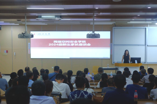 会议伊始,学院党委副书记、副院长张意教授为家长们详细介绍了学院及相关专业的发展情况。张意教授就学院的发展历程、专业优势、软硬件设施条件等方面进行了详细讲解,并重点提到习近平总书记关于网络安全的重要指示,号召大家“迈出网络强国建设新步伐”。张意教授指出,学院将牢记这一指引,继续在信息安全领域奋勇前行,致力于培养具备卓越专业能力的网络安全人才。