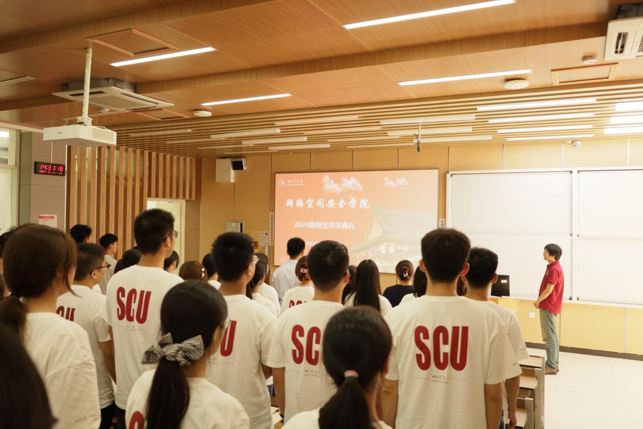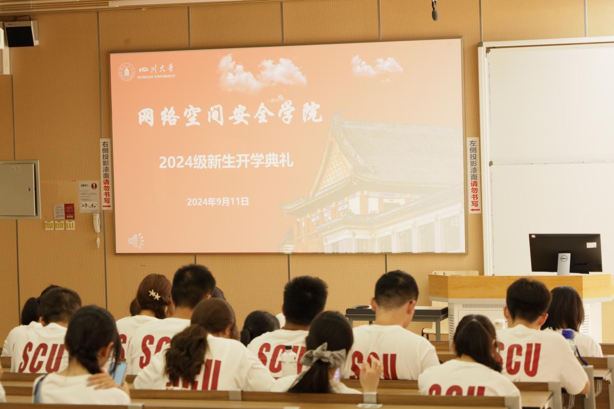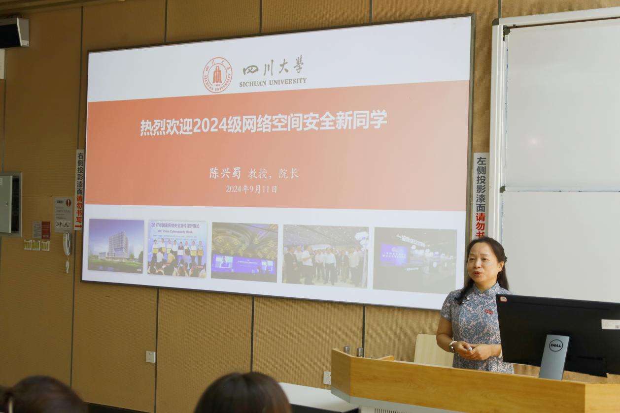 陈兴蜀院长首先代表学院全体师生欢迎2024级新同学的到来。随后她以网络安全为主题,从当前国际网络安全形势、国家对于网络安全的高度重视等多个方面展开介绍,强调了网络安全的社会需求。接着她向大家介绍了学院的发展历史、毕业生的就业情况以及学院学生的发展和成就。陈兴蜀院长鼓励新同学树立新目标,脚踏实地的同时有远大的志向。