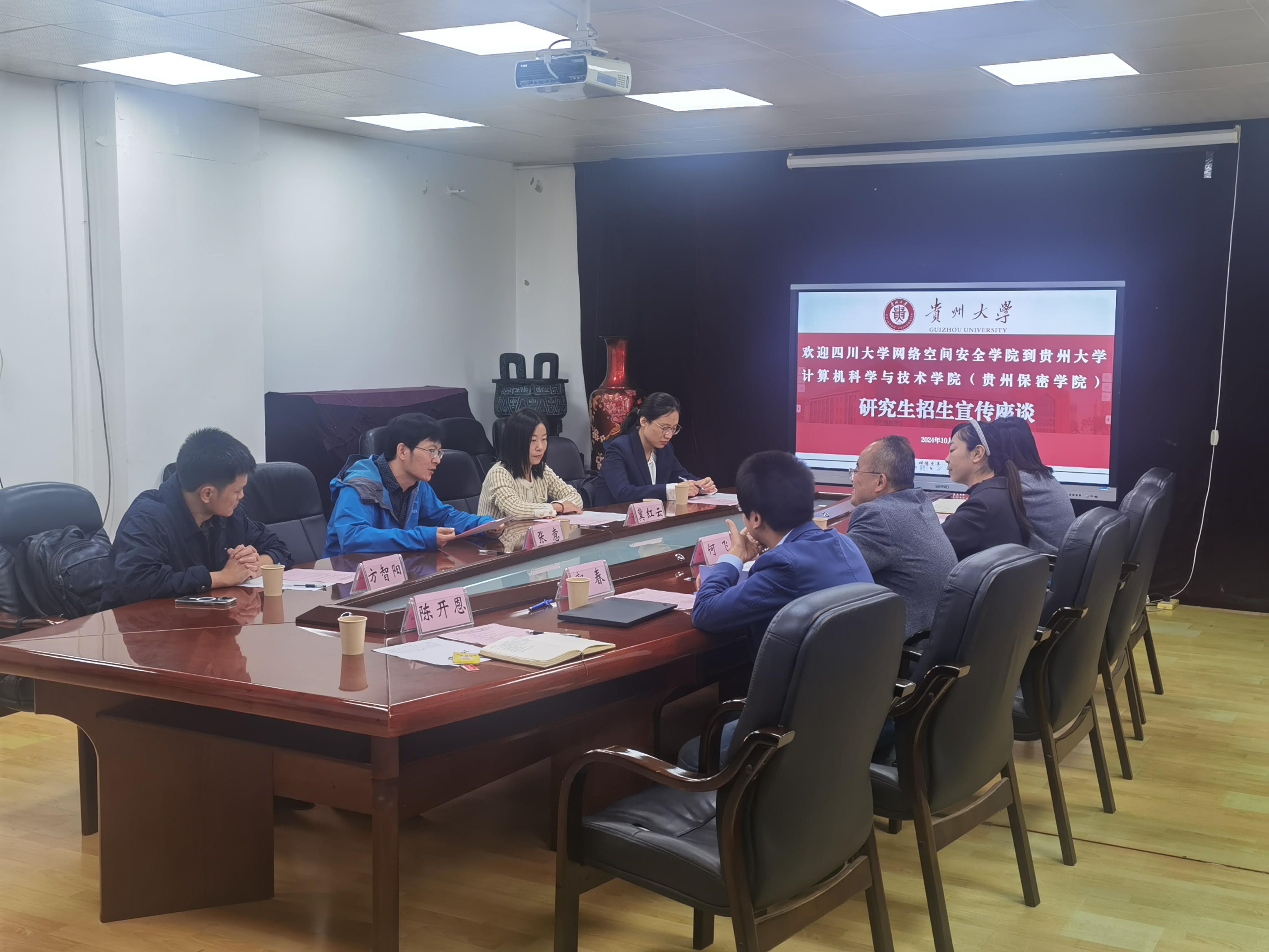10月17日,必赢官网党总支副书记兼副院长张意一行赴贵州大学计算机科学与技术学院(贵州保密学院)开展研究生招生宣传座谈。座谈由贵州大学计算机科学与技术学院(贵州保密学院)党委副书记何飞主持。计算机科学与技术学院(贵州保密学院)郭春、牛坤、陈开恩、李模弋等4名教师和20余名学生,必赢官网李晓慧、方智阳和冀红云等3名教师参加座谈。