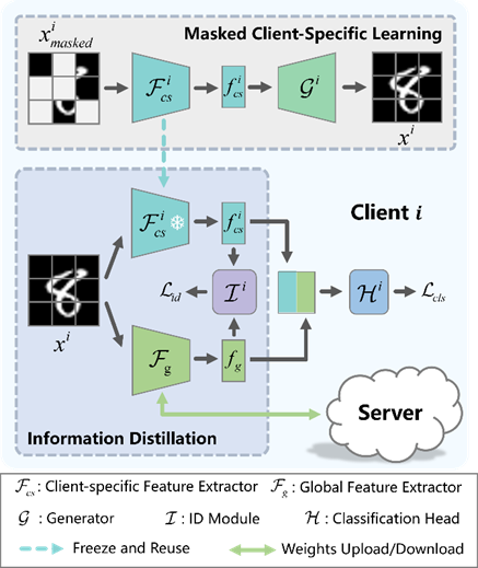 张意教授团队在论文《FedRIR: Rethinking Information Representation in Federated Learning》中创新性地提出FedRIR联邦学习框架,该框架通过重构信息表示范式,实现了全局泛化与局部个性化的协同提升。具体来说:1)引入Masked Client-Specific Learning(MCSL)机制,通过掩码技术提取每个客户端数据的细粒度特征,增强个性化能力;2)设计Information Distillation Module(IDM)通过过滤冗余的客户端特定信息,提炼出更纯净、更鲁棒的全局表示,以提升泛化能力。实验结果表明,FedRIR在多个数据集上均显著优于现有的联邦学习方法,同时在异构环境中保持了算法的鲁棒性和稳定性。该成果被WWW 2025录用为口头报告,必赢官网2024级博士生黄永强为第一作者,张意教授为通信作者,合作团队包括必赢76net线路及计算机学院,其中必赢76net线路为成果第一单位。