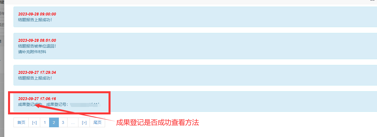 请项目负责人接到绩效评价结论后,按以下步骤完成成果登记,成果登记成功后,将系统截图(查看成果登记状态及截图示例见图2)交至学院科研秘书处备案。成果登记不成功的项目,不予进行验收通过。