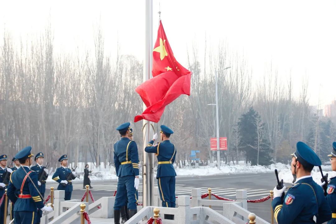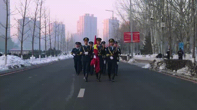 早上7时,国旗护卫队用铿锵有力、掷地有声的72个正步,向人民空军胸怀凌云壮志,搏击万里长空的72载辉煌岁月致敬。在雄壮的国歌声中,五星红旗在晨曦中冉冉升起,在场的领导及师生代表庄严站立,齐唱国歌,向国旗行注目礼。